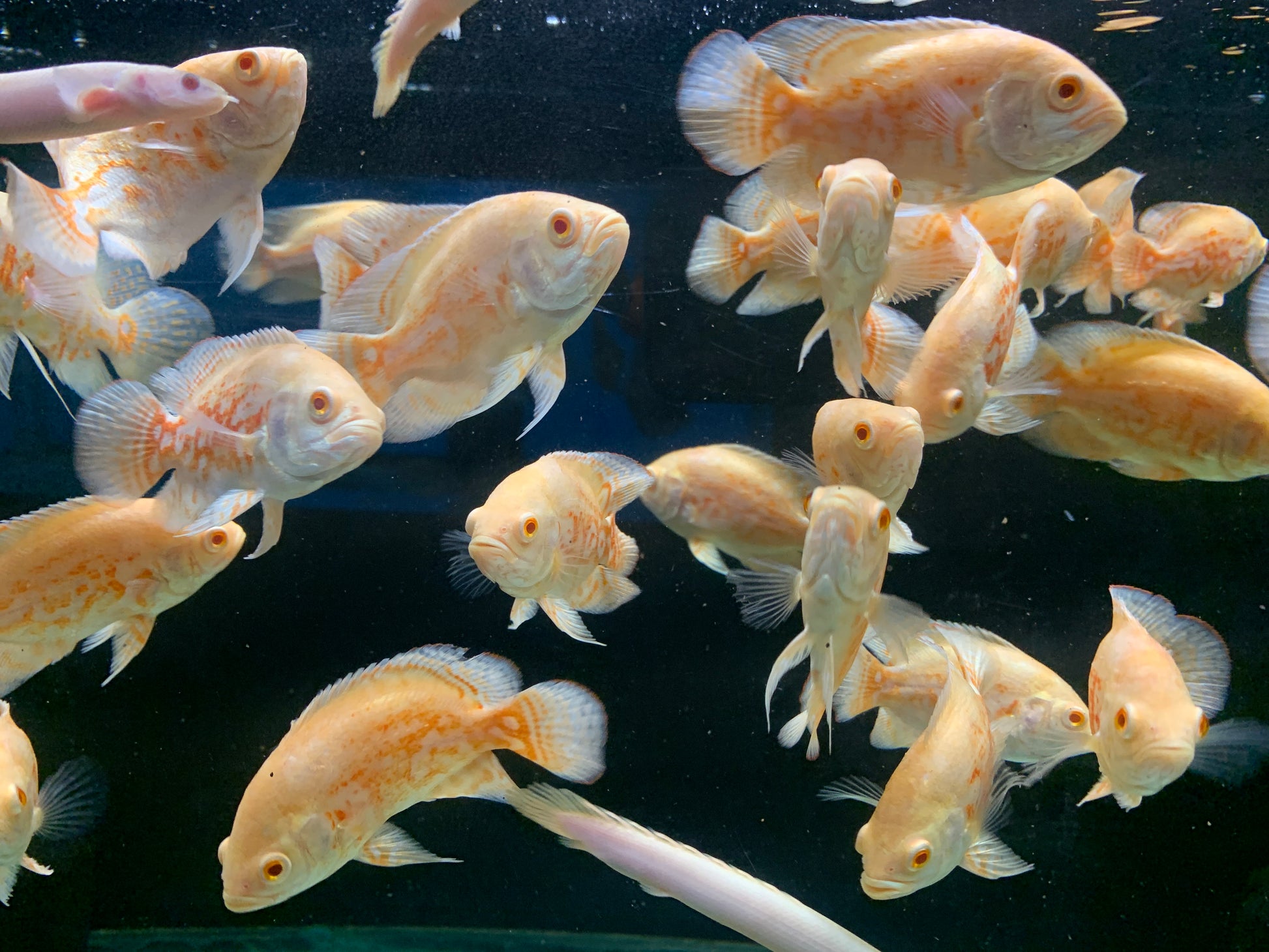 The Albino Tiger Oscar is a white and red-orange variant of the Tiger Oscar. They are large South American cichlids that are very popular in the fishkeeping hobby. With their bright and vibrant colours, they are sure to be a statement in your aquarium.